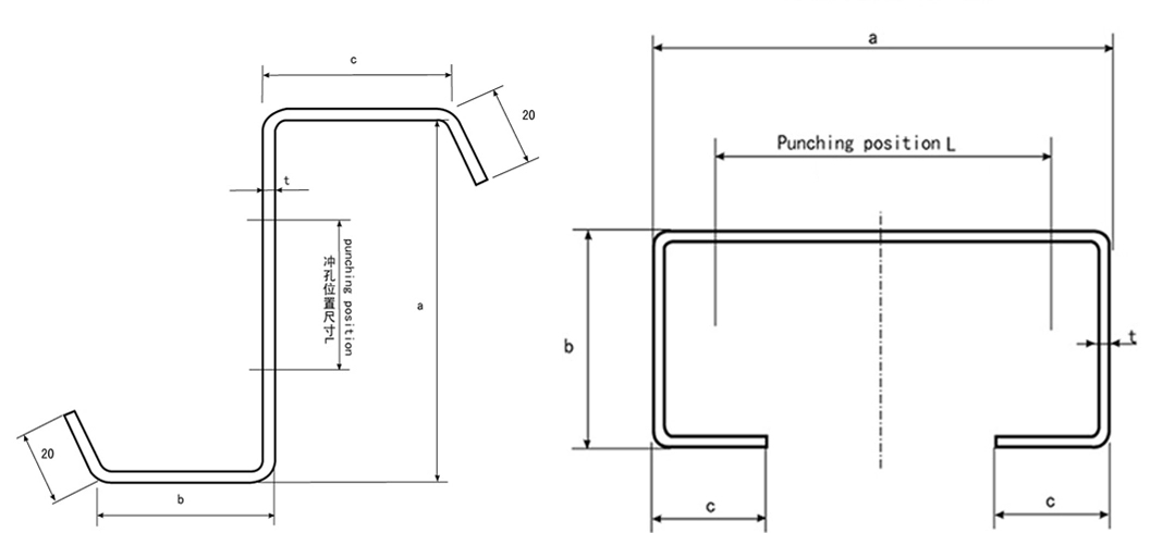 Z Purlin: A=120-300mm ; B=35-80mm ; C=10-25mm ; T=1.5-3mm